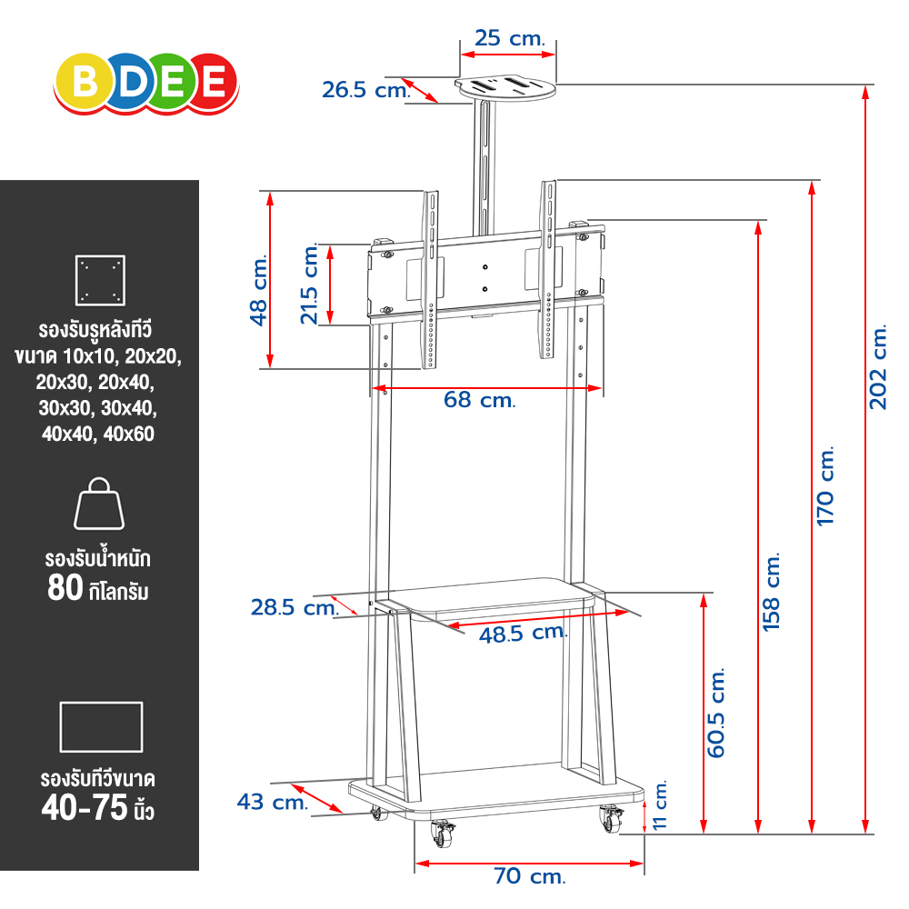 - ขนาดแผ่นเพลทของขาแขวน (กว้างxยาว) 21.5x68 ซ.ม. - ขนาดความหนาของเหล็ก มีขนาด 2 มิลลิเมตร - รองรับรูด้านหลังทีวี แนวตั้งไม่เกิน 40 ซ.ม. และแนวนอนไม่เกิน 60 ซ.ม. - ปรับระดับเพลทยึดทีวีได้ 4 ระดับ ระดับละ 7.5 ซ.ม. - ล้อเลื่อนล็อคได้ 4 ล้อ - ชั้นวางเป็นเหล็กขึ้นรูปอย่างดี มี 1 ชั้น เป็นแบบขันยึดน็อต แข็งแรง แน่นหนา (เอกสิทธิ์เฉพาะ BDEE เท่านั้น) - ขนาดของชั้นวางของ (กว้างXลึก) 48.5X28.5 ซ.ม. - ระดับของชั้นวางของจากพื้นถึงชั้นวาง 60.5 ซ.ม. - ชั้นวางของด้านบนสามารถปรับความสูงได้ตั้งแต่ 180-202 ซ.ม. สามารถเลื่อนขึ้น-ลง และถอดออกได้ (วัดระดับจากทีวี 42 นิ้ว) - ขนาดของชั้นวางของด้านบน (กว้างXลึก) 25X26.5 ซ.ม. - ระดับความสูงจากพื้นถึงปลายบนสุดของขาแขวนทีวี 170 ซ.ม. (ไม่รวมทีวี) - สามารถใช้กับจอทีวีแบบ OLED, QLED, UHD, Smart TV, LED, LCD, PLASMA ได้ทุกรุ่นทุกยี่ห้อ - ตัวเสาเป็นเหล็กกล่องสี่เหลี่ยม ขนาด 4x4 ซ.ม. รูปทรงสวยงาม - ตัวฐานเป็นเหล็กหนา วางของได้ มีขนาด (กว้างXลึก) 70X43 ซ.ม. - เคลื่อนย้ายไปได้ทุกที่ เหมาะกับงานออกบูธแสดงสินค้าต่างๆ - เหมาะสำหรับร้านค้า, หน่วยงานราชการ, บริษัทฯ ห้างร้านต่างๆ - เหมาะกับห้องที่มีพื้นที่จำกัด เช่น คอนโดฯ, หอพัก, ห้องเรียน, ห้องประชุม ห้องสัมมนา ฯลฯ