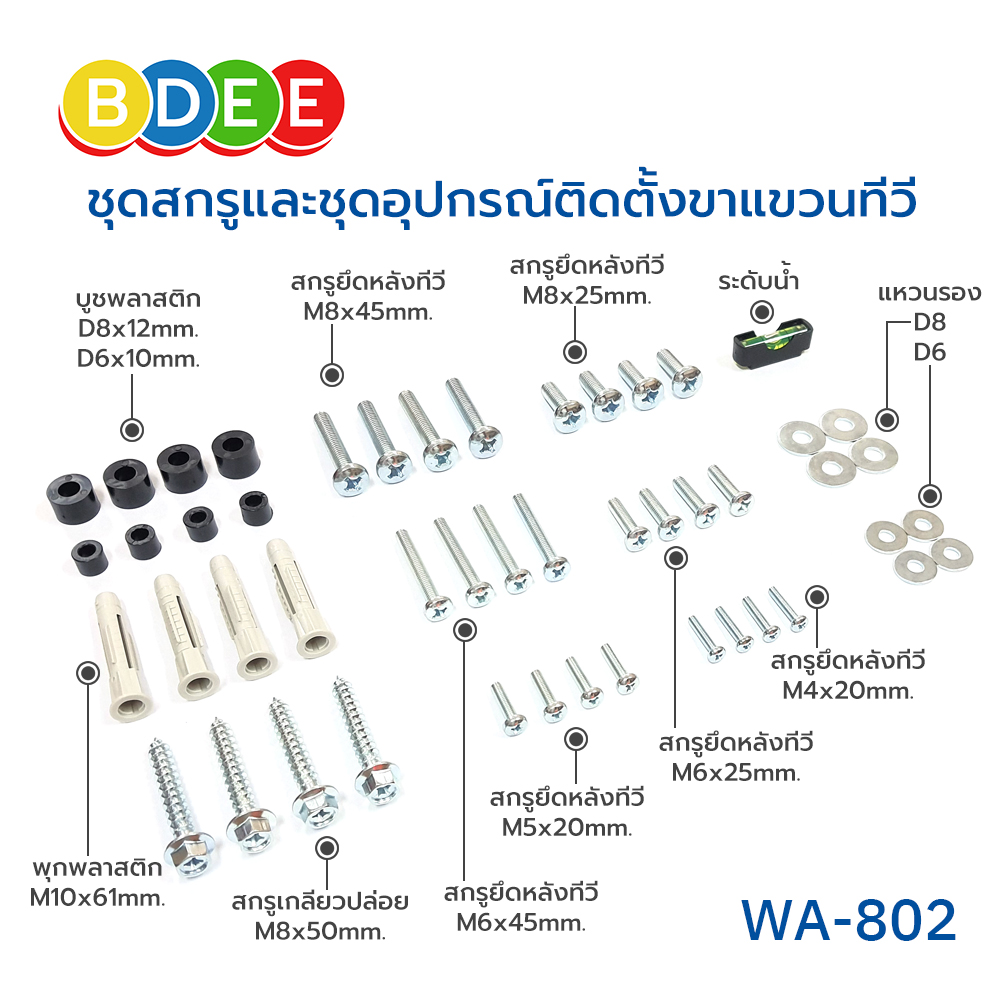 - ขนาดแผ่นเพลทติดผนัง 20x47.5 ซ.ม. (กxย) เหล็กหนา 2 ม.ม. - ขนาดแผ่นเพลทของขาแขวน 13.5x65.5 ซ.ม. (กxย) เหล็กหนา 1.4 ม.ม. - ขนาดของขาแขวนทีวี 3x42 ซ.ม. (กxย) เหล็กหนา 1.4 ม.ม. - รองรับรูด้านหลังทีวี แนวตั้งไม่เกิน 40 ซ.ม. และแนวนอนไม่เกิน 60 ซ.ม. - สามารถปรับก้มได้ 10 องศา และปรับเงยได้ 2 องศา - มีแขน 2 แขน เพื่อให้รองรับน้ำหนักได้มาก - โดยใน 1 แขน มี 2 ท่อน สำหรับปรับส่ายซ้าย-ขวา ยืดเข้าออกได้ - ปรับเอียงซ้าย-ขวาได้ กรณีติดตั้งไม่ขนานกับพื้น - ระยะห่างสั้นสุดจากผนัง 5 ซ.ม. และยืดได้ยาวสุด 46 ซ.ม. - รับน้ำหนักได้ 40 กิโลกรัม - มีคู่มือภาษาไทย - มีระดับน้ำ, เครื่องมือ และชุดอุปกรณ์สำหรับการติดตั้ง รวมถึงน็อตยึดหลังทีวีให้ทุกรุ่น ทุกยี่ห้อ