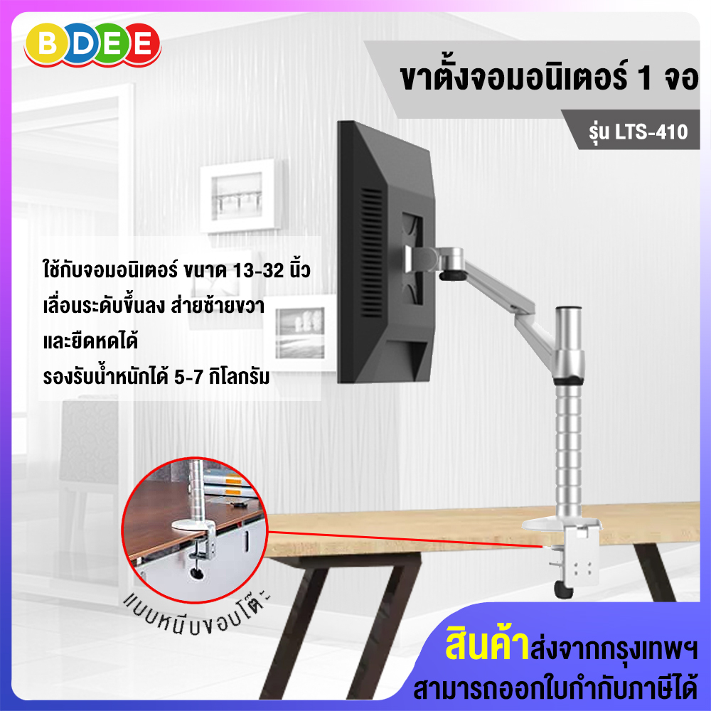ขาตั้งจอมอนิเตอร์ แบบยึดกับขอบโต๊ะ สามารถติดจอมอนิเตอร์ ขนาด 13-32 นิ้ว รูปทรงสวยงาม งานปราณีต เรียบร้อย สามารถเลื่อนระดับขึ้นลง และส่ายซ้ายขวาได้ ในยามที่ไม่ต้องการใช้ สามารถผลักออกจากพื้นที่โต๊ะทำงานได้ ทำให้โต๊ะทำงานมีพื้นที่เหลือใช้ทำงานอย่างอื่น