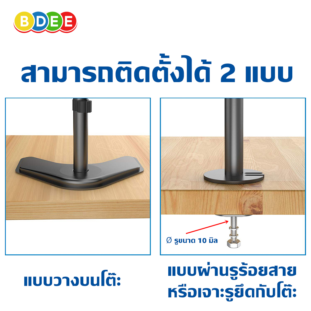ขาตั้งจอมอนิเตอร์ 1 จอ BDEE รุ่น MS-3102 แบบวางบนโต๊ะ สามารถติดจอมอนิเตอร์ขนาด 13-32 นิ้ว ได้ทุกรุ่น ทุกยี่ห้อ ที่มีรูยึดหลังจอมอนิเตอร์ ขนาดไม่เกิน 10x10 ซ.ม. วัสดุเป็นเหล็กพ่นสีอบความร้อนอย่างดี (Powder Coating) สามารถเลื่อนระดับแป้นขึ้นลง ส่ายซ้ายขวา รวมถึงปรับจอก้ม-เงย และหมุนหน้าจอได้ รูปทรงสวยงาม งานปราณีต เรียบร้อย ทำให้เป็นระเบียบประหยัดพื้นที่บนโต๊ะทำงาน