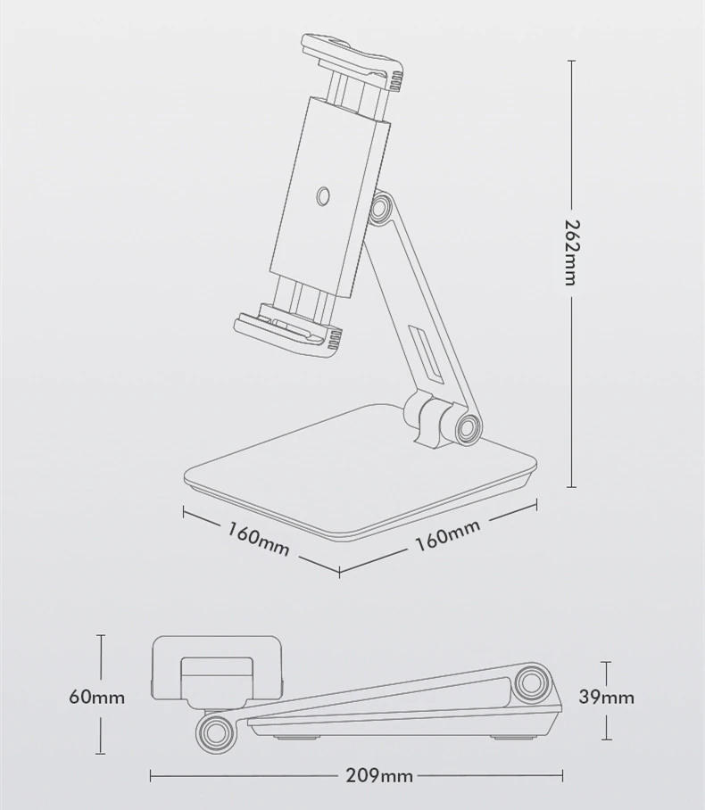 ใช้ได้กับโทรศัพท์มือถือและแท็บเล็ต ขนาดตั้งแต่ 4.7 ถึง 12.9 นิ้ว ตัวจับสามารถยืดได้ตั้งแต่ 13-22.4 ซ.ม. ฐานกว้าง 16x16 ซ.ม. สูงประมาณ 26 ซ.ม. (รวมตัวจับ) สินค้าทำจากวัสดุอลูมิเนียมอัลลอยอย่างดี ไม่เป็นสนิม สามารถปรับระดับองศาสูงต่ำได้ ปรับความหนืดในการโยกขึ้นลงได้ มีเครื่องมือในการปรับ ซ่อนไว้ใต้ฐาน ตัวจับทำจากพลาสติค ABS สามารถหมุนได้ 360 องศา เพิ่มความหรูหราให้กับโต๊ะทำงานของคุณ สินค้ารับประกัน 1 ปี