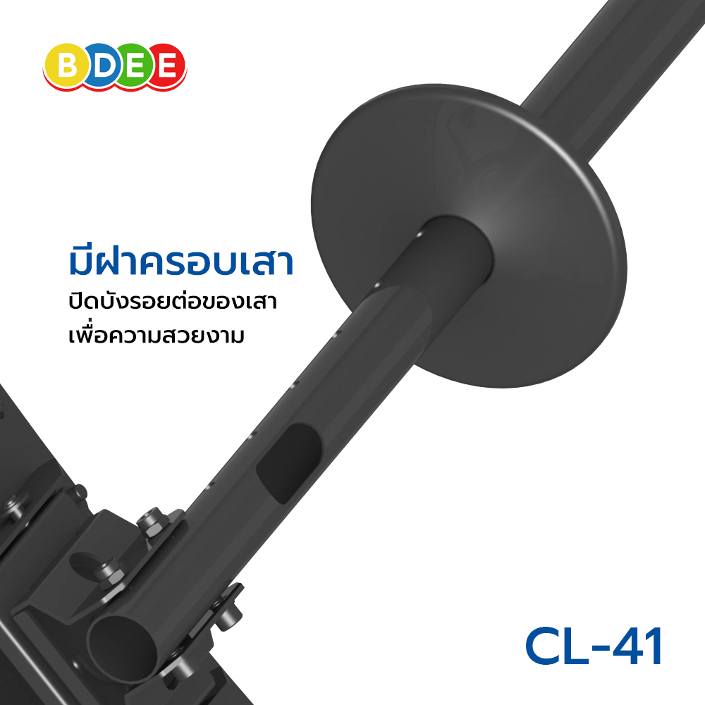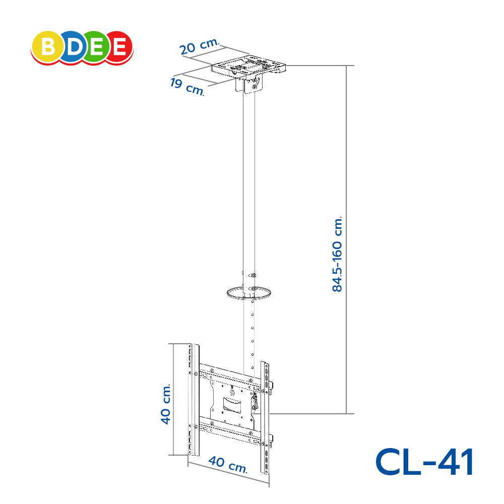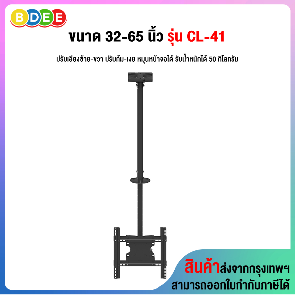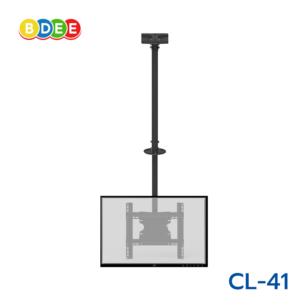 ขาแขวนทีวี BDEE รุ่น CL-41 เป็นขาแขวนทีวีสำหรับติดเพดาน แบบ 1 จอ เสายาว 84.5-160 ซ.ม. ฐานยึดเสาออกแบบมาให้สามารถติดกับผนังหรือคานได้ด้วย สามารถปรับก้ม-เงย ส่ายซ้าย-ขวา และหมุนหน้าจอได้ เหมาะสำหรับใช้กับทีวี ขนาด 32-65 นิ้ว ทุกรุ่น ทุกยี่ห้อ รูปทรงสวยงาม เหล็กหนา แข็งแรง ทนทาน เคลือบด้วยสีฝุ่นอบความร้อนอย่างดี