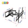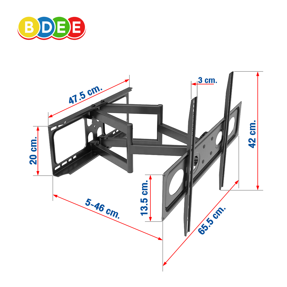 - ขนาดแผ่นเพลทติดผนัง 20x47.5 ซ.ม. (กxย) เหล็กหนา 2 ม.ม. - ขนาดแผ่นเพลทของขาแขวน 13.5x65.5 ซ.ม. (กxย) เหล็กหนา 1.4 ม.ม. - ขนาดของขาแขวนทีวี 3x42 ซ.ม. (กxย) เหล็กหนา 1.4 ม.ม. - รองรับรูด้านหลังทีวี แนวตั้งไม่เกิน 40 ซ.ม. และแนวนอนไม่เกิน 60 ซ.ม. - สามารถปรับก้มได้ 10 องศา และปรับเงยได้ 2 องศา - มีแขน 2 แขน เพื่อให้รองรับน้ำหนักได้มาก - โดยใน 1 แขน มี 2 ท่อน สำหรับปรับส่ายซ้าย-ขวา ยืดเข้าออกได้ - ปรับเอียงซ้าย-ขวาได้ กรณีติดตั้งไม่ขนานกับพื้น - ระยะห่างสั้นสุดจากผนัง 5 ซ.ม. และยืดได้ยาวสุด 46 ซ.ม. - รับน้ำหนักได้ 40 กิโลกรัม - มีคู่มือภาษาไทย - มีระดับน้ำ, เครื่องมือ และชุดอุปกรณ์สำหรับการติดตั้ง รวมถึงน็อตยึดหลังทีวีให้ทุกรุ่น ทุกยี่ห้อ
