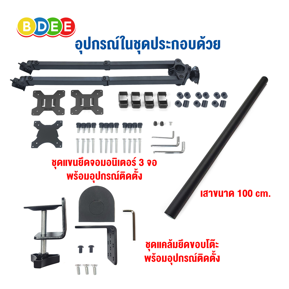 ชุดประกอบเอง เสายาว 100 ซ.ม.+แคล้มยึดขอบโต๊ะ+แขนยึดจอมอนิเตอร์ 3 จอ (ติดจอมอนิเตอร์ขนาด 13-24 นิ้ว เรียงกันได้ 3 จอ) วัสดุเป็นเหล็กพ่นสีอบความร้อนอย่างดี รูปทรงสวยงาม งานปราณีต เรียบร้อย ตัวจอสามารถเลื่อนระดับขึ้นลง ส่ายซ้ายขวา ตัวแป้นยึดจอปรับก้มเงยได้ เอียงซ้ายขวาได้ และหมุนได้ 360 องศา ทำให้ประหยัดพื้นที่บนโต๊ะทำงาน *** แต่ละจอต้องกว้างไม่เกิน 57 ซ.ม.